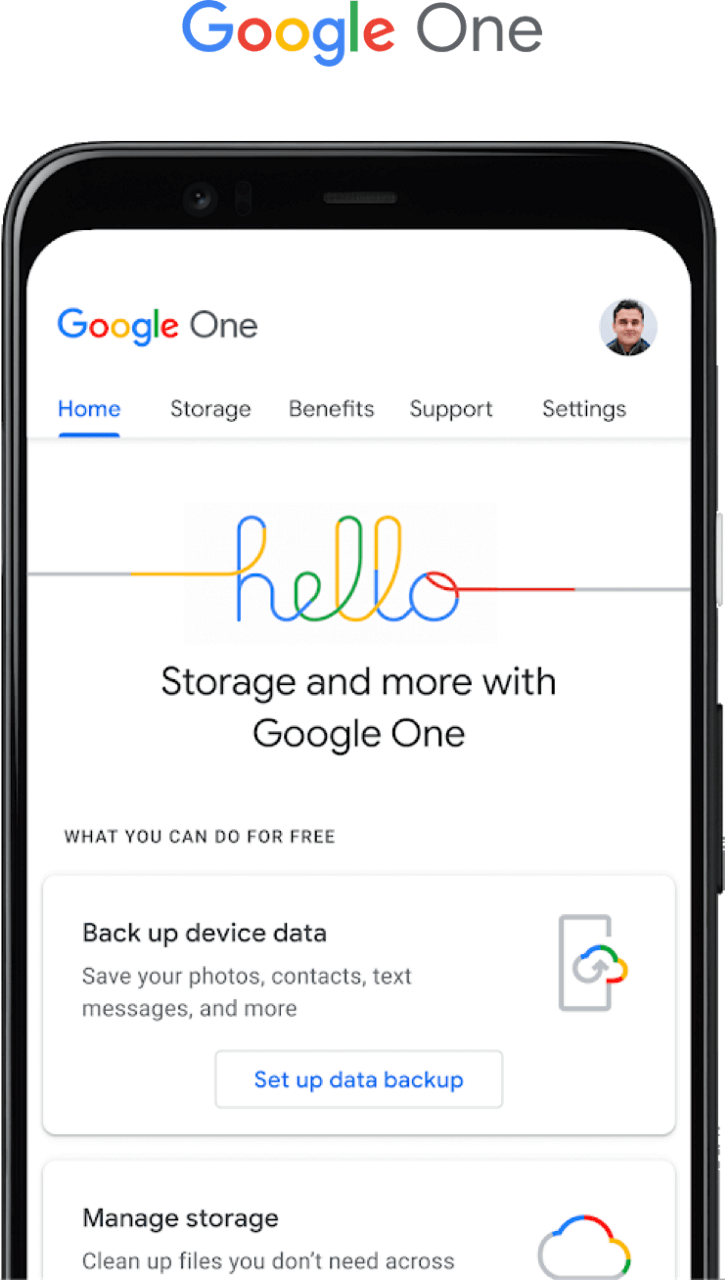 Google One helps you back up the important things on your phone, including your photos, videos, contacts, and calendar events. Android users can download the Google One app on Google Play to get started. For iOS users, access backups through your browser.