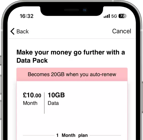 Get extra data on us with an Auto-Renew Data Pack. They work like a subscription, giving you the same amount of data every month unless you cancel. But they’re commitment-free – you can cancel at any time.